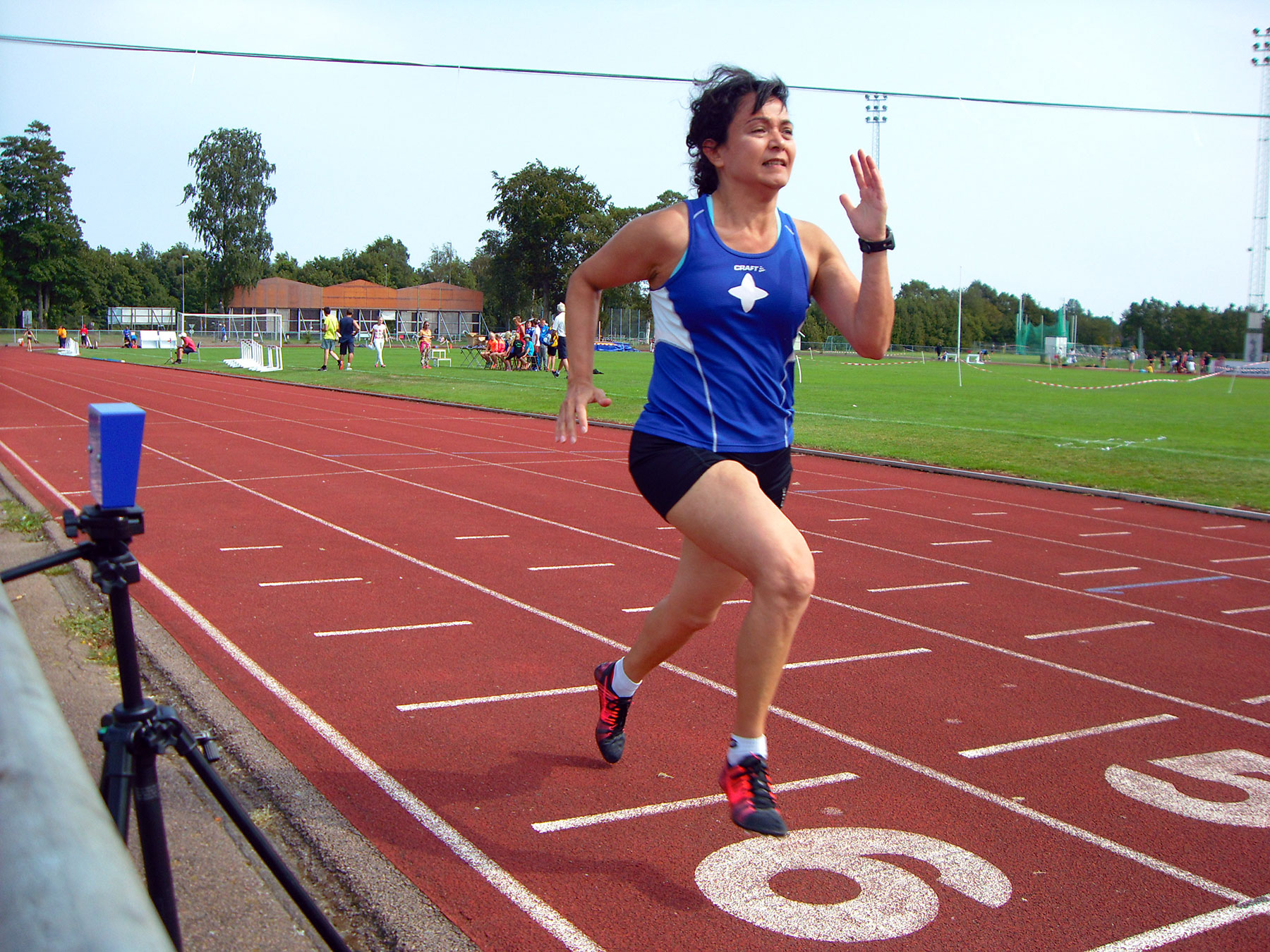 När vi anlände till idrottsplatsen höll försäljningstältet på att blåsa iväg och inför Simas start på 100m kändes det som åtminstone +5 m/s i ryggen. Vindmätaren stannade dock på –0.2 och inte heller tiderna indikerade att tjejerna haft hjälp av vinden. Byig sidvind med andra ord. Efter semestern är Simas fysiska form kanske något sämre men löptekniken var intakt. Kanske finns det ändå lite att hämta redan till SUS om två veckor med bättre häl-rump kick under accelerationen.