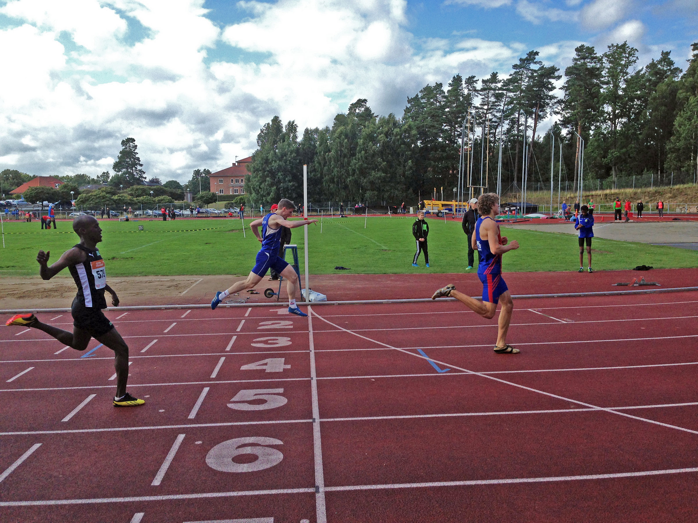 Det blåste lika mycket under Björns lopp en halvtimme senare och jag hade själv svårt att hålla kameran stilla medan jag filmade. Björn sprang återigen en mycket bra hundring – strax över 11 den här gången. Fullfartslöpningen ser förhållandevis bra ut och det var först strax före mål som 200m-specialisten Dennis Karanda hann förbi. Björn får en ny chans redan imorgon på seriematchen.