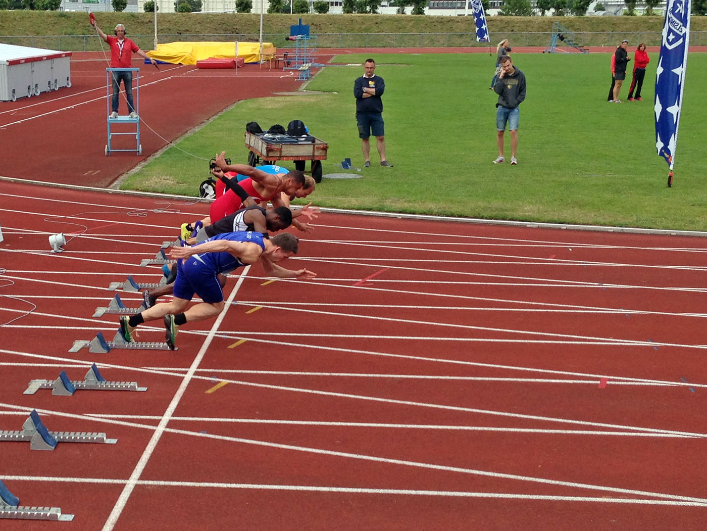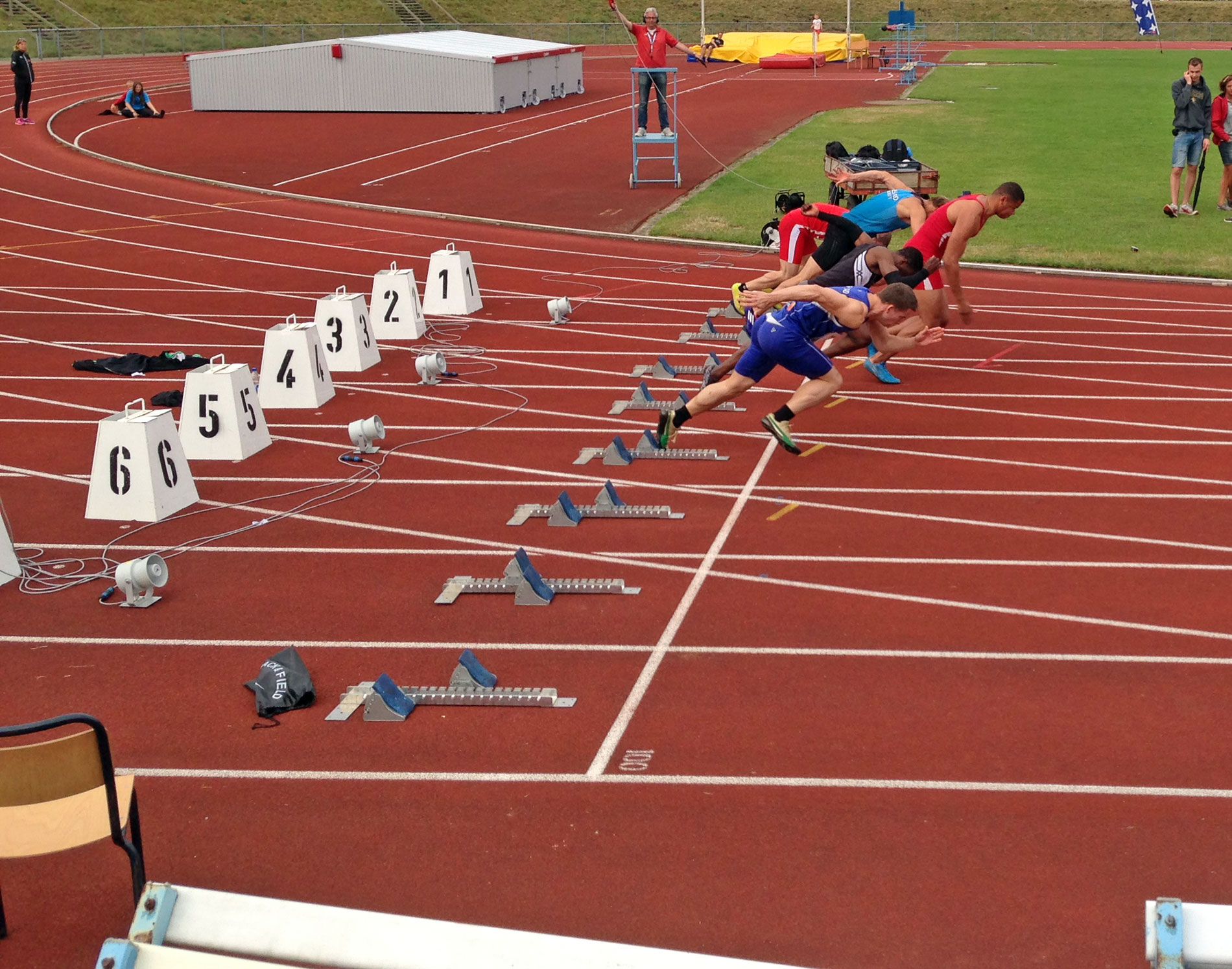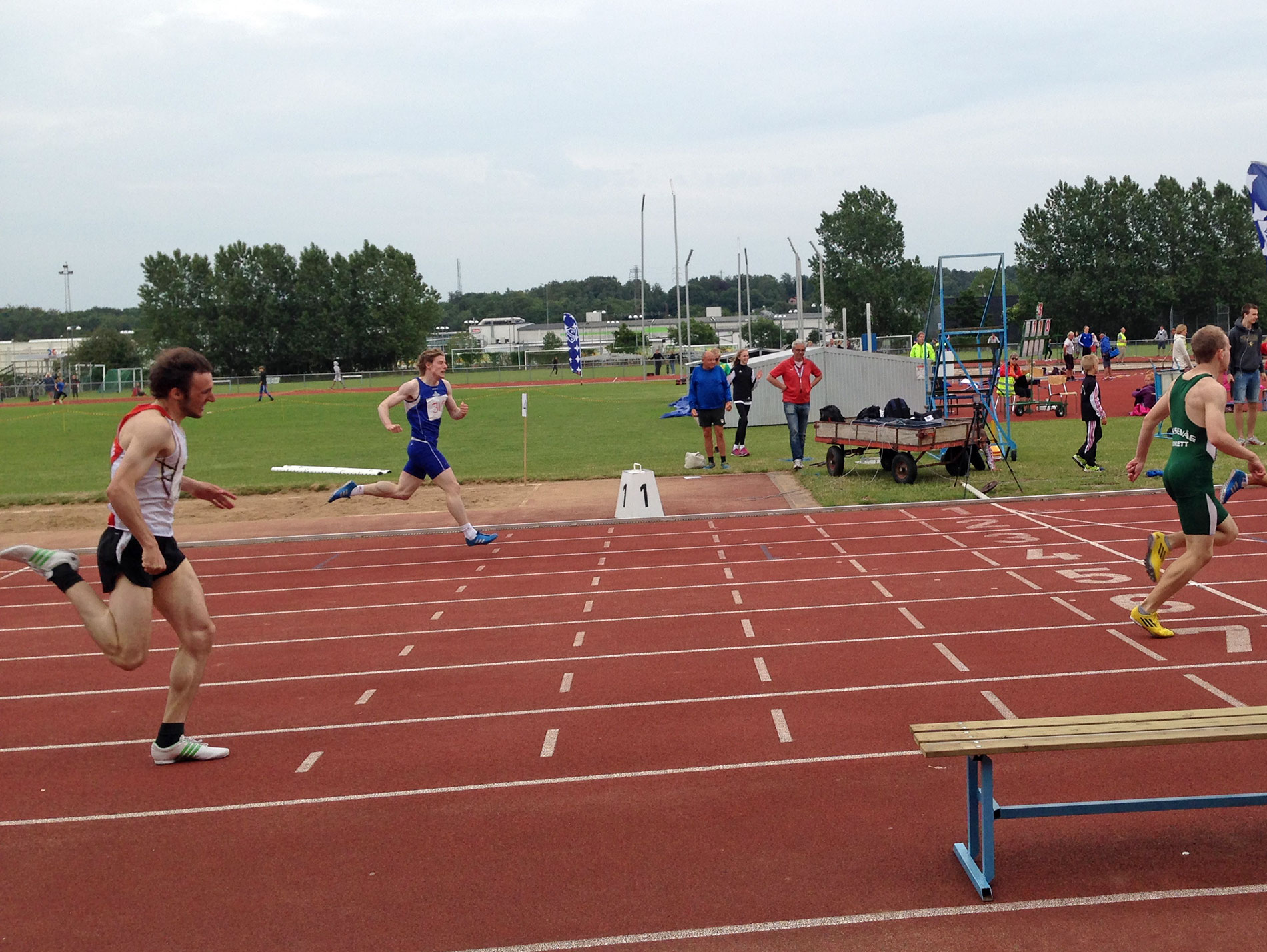 Nu hade vinden bytt riktning och det var dessutom klart kyligare. Tiderna i försöksheaten blev därefter. Kul dock att Viktor M gjorde ännu en tävling. Hoff (vars icke-höjdhoppande dagen innan förbigås med tystnad) gjorde sin första 100m-tävling på flera år. Han var bara drygt fem tiondelar efter Björn och med bättre förhållanden skulle det gamla perset med all sannolikhet ha varit historia. I loppets slutskede stramade framsidorna och efter loppet kändes det så illa att han blev lindad av sjukvårdare. Det kändes bättre några timmar senare, så det var förhoppningsvis falskt alarm.